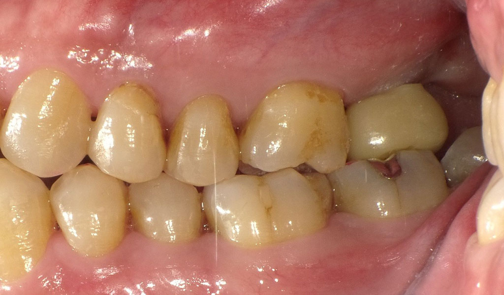 術前検査(歯周病菌の検査(PCR検査))を行ったところ、Pg菌、Td菌、Tf菌の数値が高かったため、投薬及びクリーニングによる歯周病内科治療を実施。フラップレス手術にて、左上7番の骨にインプラントを埋め込みました。歯周内科治療終了後、再PCR検査によりPg菌、Td菌、Tf菌の数値が問題ないレベルまで下がったことを確認。インプラントと骨がしっかり結合するまで3ヶ月待ち、インプラントの上に人工の歯を被せる治療を行いました。
