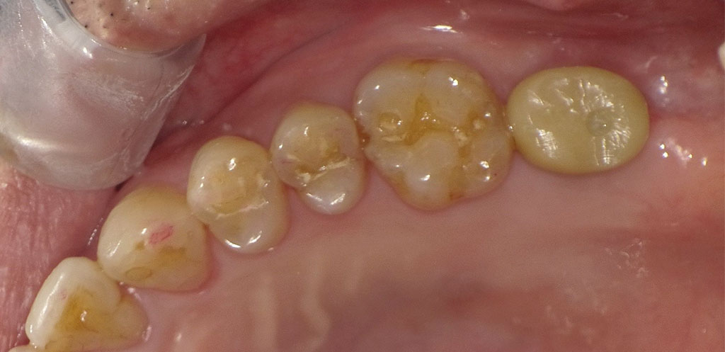 60代男性・神奈川県高座郡在住。左上7番を他院にて抜歯後、部分入れ歯ができないことから、当院にてインプラント治療。人工歯はジルコニア人工歯。スクリューリテインにて固定しました。歯周病菌の数が多いため、並行して歯周内科治療も実施。