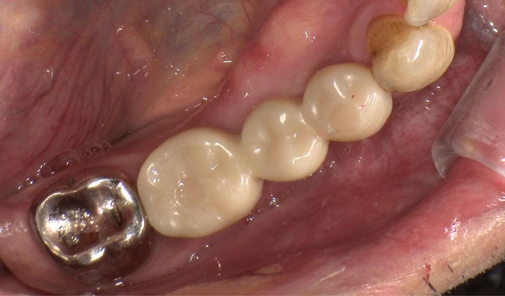 50代男性・藤沢市在住。右下奥歯のブリッジが割れていて、他院にて4本ブリッジをすすめられたがインプラントが長持ちするならということで当院を受診。当院にてインプラント治療。人工歯はジルコニア人工歯。スクリューリテインにて固定しました。