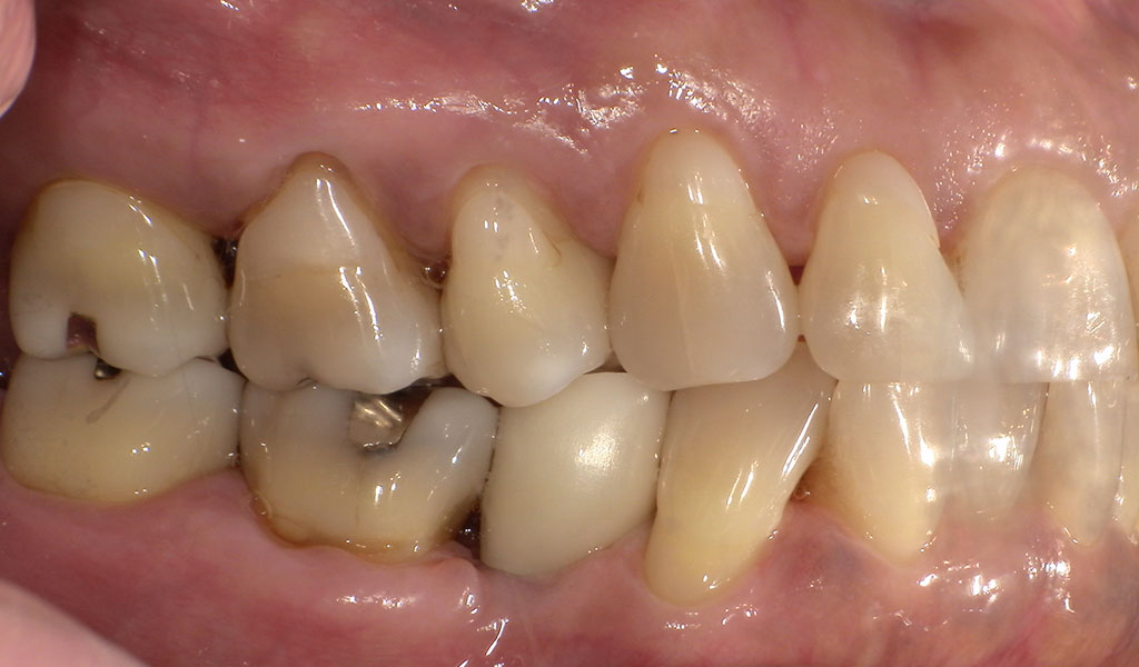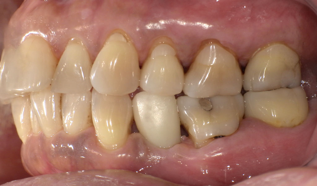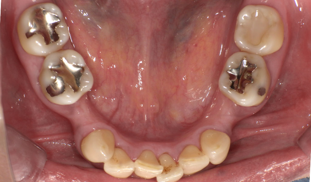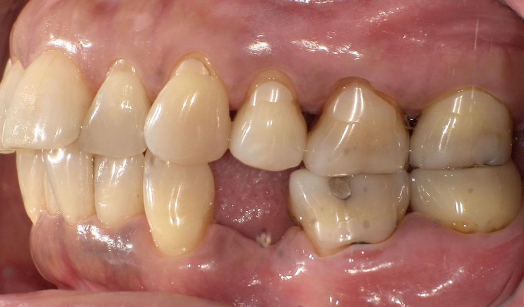 50代女性・横浜市在住。他院にて歯周病により、右下4番、左下4番を抜歯、当院にてインプラント治療。人工歯はジルコニア人工歯。スクリューリテインにて固定しました。歯周病菌の数が多いため、歯周内科治療も実施しました。
