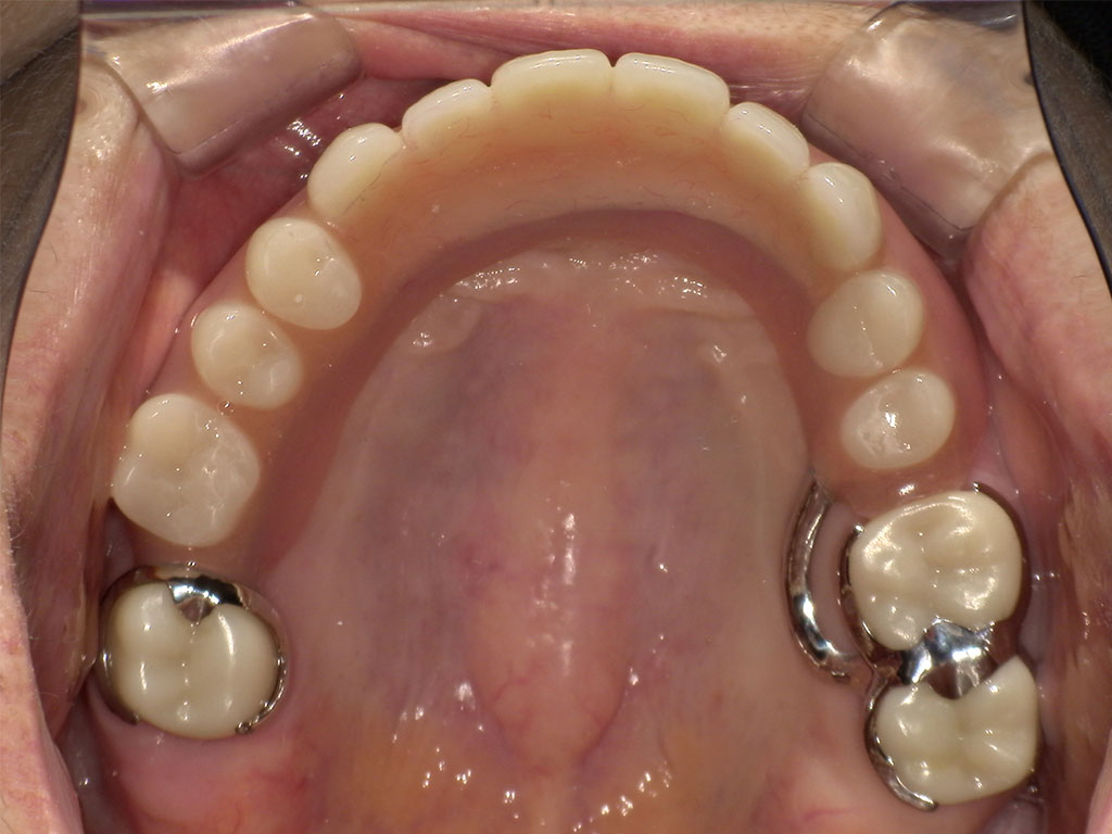 他院にて作成した上顎の入れ歯が合わないため、当院で作成。上顎に合わせ、下顎の入れ歯も作成。インプラント手術が怖いということで自費の入れ歯をご希望とのこと。金属部分が目立たない、フィット感があるため、上顎右12345番および左123456番の欠損、下顎右567番および左567番を補う自費の入れ歯欠損を補う自費の入れ歯を作成。異物感をできるだけ少なくするために、オールプラスチックのスマイルデンチャーは選択せず、舌で触れる部分はメタルで薄く加工することにしました。またクラスプも金属のため、緩くなったら締めなおせるというメリットもあリます。デジタルスキャナーで型取りをして、3Dプリンターで模型を作成し、その精密な顎模型を製作。そして当院専属の入れ歯技工士早澤が入れ歯を精魂込めて製作いたしました。