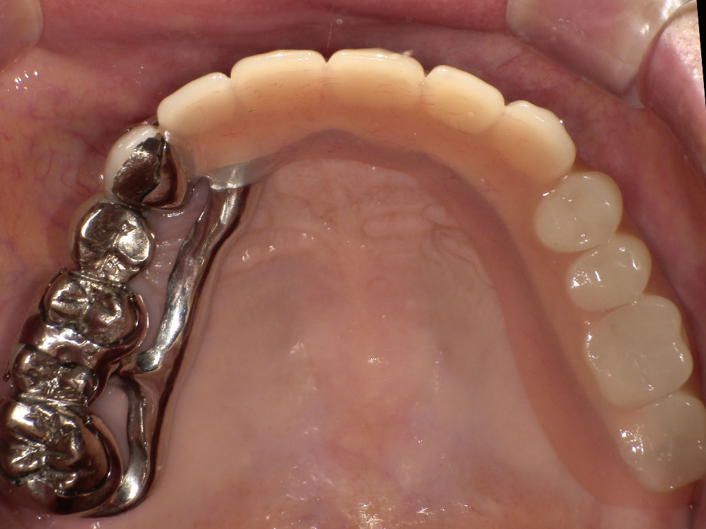 70代女性。横浜市在住。今まで下顎に保険の入れ歯を装着していたが、入れ歯の臭いが気になるということで来院。インプラント手術も怖いということで異物感が少ないことと、目立ちにくいことを両立させて欲しいという自費の入れ歯をご希望とのこと。