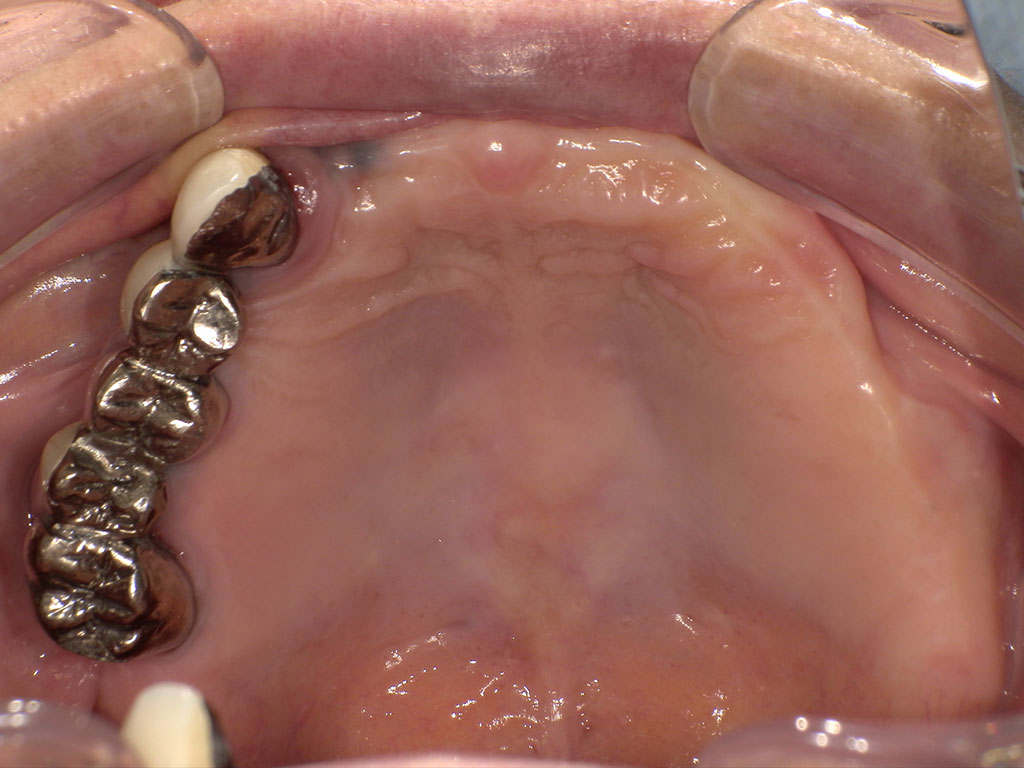 70代女性・横浜市在住。上の入れ歯が臭うため上顎にクラスプの目立たない自費の入れ歯を作成。異物感が少ないことと、目立ちにくいことを両立させて欲しいという要望でした。