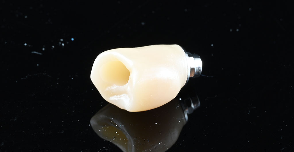 ジルコニアクラウンを装着するために元のクラウンを外し、歯の形成を行い光学印象(プライムスキャンによる)型取りを行いました。光学印象のデータを元に当院の院内技工室にてデジタル加工を行い、ジルコニアクラウンを作成し、セットを行いました。