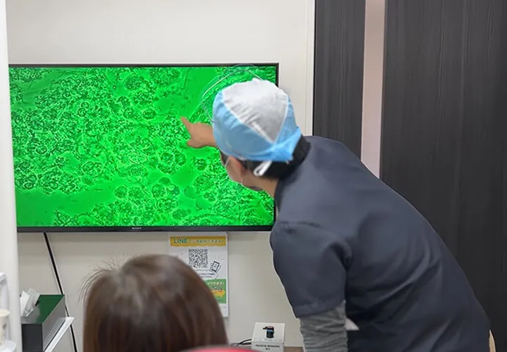 当院では、3,000倍の位相差顕微鏡を使用し、お口の中に存在する細菌を確認しています。細菌の種類や量を把握することで、患者様のお口の状態をより正確に判断できます。実際に顕微鏡で見た映像をお見せしながら、歯科衛生士が適切なケア方法をご説明いたします。
